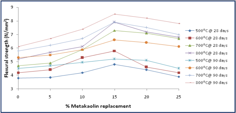 - 3. Based on the conducted investigation, it can be concluded that relative compressive strengths increase sharply at ages between 3–7 days after which compressive strength increases slowly up to 28 days. It is demonstrated that metakaolins activated at higher temperature have more reactivity at early ages and in contrast at lower temperature show more reactivity at later ages.